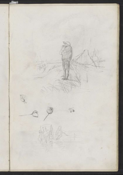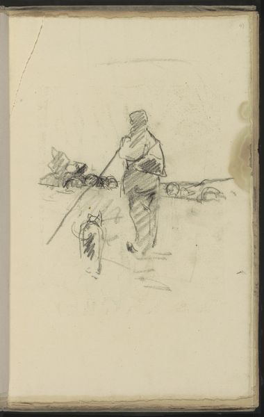 Curator: This pencil sketch, housed here at the Rijksmuseum, is entitled "Schaapherder die op een staf leunt," or "Shepherd Leaning on a Staff" by Willem Witsen, dating from around 1884 to 1887. It feels intimate. Editor: There's a vulnerability in its unfinished quality, isn't there? It looks like a fleeting impression, almost as if Witsen were capturing a memory or a feeling more than a detailed portrait. The way he uses light and shadow creates this mood of solitude. Curator: Indeed. The Impressionist influence is visible here. Witsen belonged to the Amsterdam Impressionism movement. What I find compelling is how he uses a seemingly simple image to reflect broader socio-political themes. The figure of the shepherd, traditionally a symbol of rural idyll and pastoral care, is presented with such stark simplicity. It almost suggests the erosion of traditional ways of life in the face of urbanisation and industrialisation. Editor: Interesting point. The shepherd’s staff, a symbol of authority and guidance, almost looks like it's just there for him to lean on for support. A support because the flock that provides value and livelihood is no more. It feels less like an active tool and more like something he is using as an aid while existing alone on desolate land. It speaks volumes, doesn't it, about changing social roles and individual struggles in late 19th-century Holland. Curator: Absolutely, and even his clothing indicates how the figure straddles this historical transition from tradition to something new and still yet uncertain, influencing the meaning the drawing can contain. His clothing denotes more of a workingman’s clothing rather than clothing alluding to the ‘good shepherd’. Editor: It's the way the light catches his form that draws me back again and again, casting him alone as it makes this work linger. I now know why. It's melancholy with the human experience of finding ourselves, through change. Curator: Seeing how one figure's symbolic weight interacts across artistic styles, schools of thought, materials, and the passage of time always amazes. Editor: It really makes you reconsider a shepherd's symbolic significance as an image beyond that traditional rural context.
