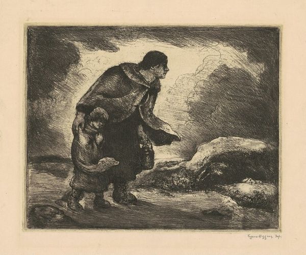 Eugene Higgins made this print, Homeward Bound, with etching, and it's a beautiful example of how a limited palette can still pack an emotional punch. The texture here is everything; it’s all about the lines, a dense weave that creates depth and shadow. Look at the way the lines follow the form of the woman’s shawl, or the scratchy, chaotic marks that build up the foreground, it’s like Higgins is carving his way through the darkness, revealing the figures as they emerge from the shadows. That concentration of marks around the base of the figures gives the impression of ground beneath their feet, a path worn down by years of use. The way he's handled the etching, it reminds me a little of Käthe Kollwitz, with that same sense of empathy for the working class, a shared understanding of struggle and resilience. Art, for me, is always about these connections, these echoes across time and space.