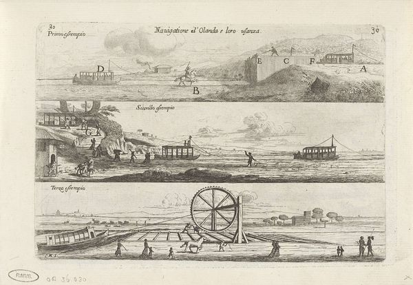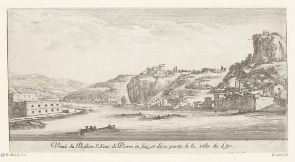 Curator: We're looking at "Gezicht op Lyon," or "View of Lyon," an etching crafted by Israel Silvestre. The work dates from somewhere between 1631 and 1691, during the Baroque period. It currently resides in the Rijksmuseum. Editor: My first impression is one of serenity, yet it feels meticulously structured. The dark, controlled lines lend a cool, almost architectural precision to the landscape, dividing the scene into neat horizontal layers of water, city, and hills. Curator: Yes, it's quite deliberate, isn’t it? Silvestre often employed a rigorous system when designing such cityscapes. Notice how Lyon rises, tier upon tier. To the contemporary viewer, it represents power, permanence. The etched lines, while precise, suggest the delicate balance between human endeavor and the enduring presence of nature. Consider the two boats in the water: What might they have symbolized for viewers at the time? Editor: The boats are key, I think. They introduce a rhythm and scale against the fixed backdrop. Their presence almost activates the scene, preventing the strict linearity from feeling static. I am particularly drawn to the varying width of the lines in the print – it allows the eye to perceive distance in surprising detail. It is this detail, such as the small figures, which invites one into the otherwise imposing and controlled Baroque landscape. Curator: Exactly. Lyon, positioned along key waterways, wasn't just a beautiful scene; it was a pivotal site for trade, religion, and social movements. So, Silvestre isn’t merely documenting; he's placing Lyon within a historical and almost mythic narrative. Editor: A narrative underscored by the strategic composition. See how the highest point, perhaps a fort or a religious structure, acts as a visual anchor – almost an exclamation point in the design. Curator: Reflecting on Silvestre's "View of Lyon," one truly understands how landscape depictions captured more than the literal—they encapsulated ambitions, beliefs, and societal values. Editor: And from a purely visual perspective, the masterful deployment of line and space succeeds in transforming geography into a compelling emotional and symbolic terrain.