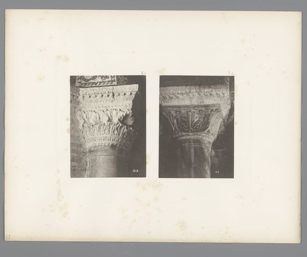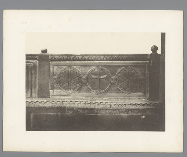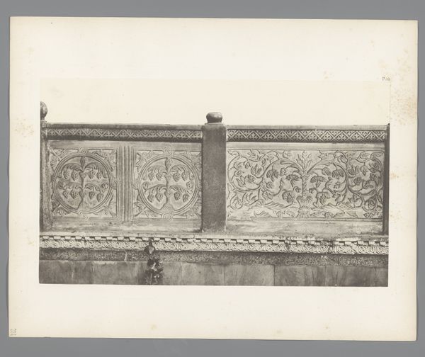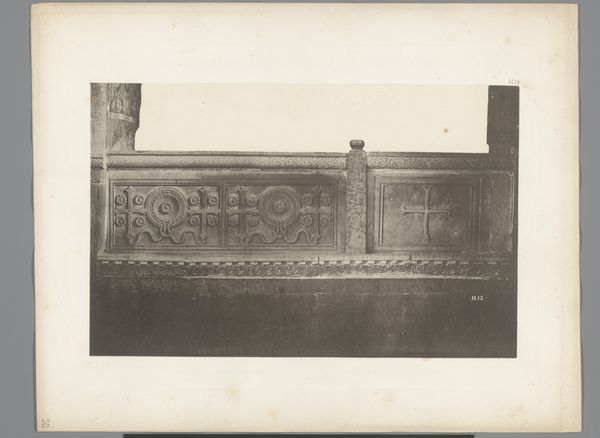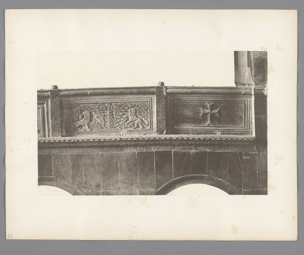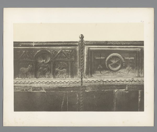Curator: The gelatin-silver print before us, titled "Detail van de San Marco in Venetië," presents an intriguing snapshot of architectural ornamentation. Its creator is Carl Heinrich Jacobi, and its date places it before 1885. What are your first impressions? Editor: It feels like stepping back in time. The image is soft, muted…almost dreamlike. Like a half-forgotten memory of a place, rendered in shades of grey. There's something really compelling about the aged paper itself; it lends such atmosphere. Curator: Absolutely. Consider the context: Venice as a crossroads of cultural exchange, where Byzantine, Roman, and Oriental influences converged. The basilica is a potent symbol of Venice's complex political and religious identity, mirroring a long legacy of conquest and adaptation. Editor: Yes, it’s fascinating. Those geometric details combined with the repeated palmette motif evoke echoes of the ancient world, which brings to my mind classical ideals and aesthetics as they permeate across epochs... Do you feel how tactile it is, too? I imagine running my fingers over those carved surfaces...feeling the cool stone. Curator: I see that tactile sense you mean, though, for me, it raises questions about preservation and access. Who gets to touch the past? Who has the authority to interpret it? What is the impact of such photography? We see, but what might remain unseen, un-photographed, deliberately left out? Editor: Oh, definitely, there are levels here about who gets to represent, to show, to own the experience... But the play of light is interesting. This moment captured...it feels very still, very peaceful. You almost expect to hear the soft lapping of water nearby... it kind of makes you want to lose yourself in Venice's labyrinthine streets. Curator: Indeed. Jacobi's photograph serves as a reminder that architecture and urban spaces are imbued with historical, cultural, and political significance. It challenges us to consider the enduring power of visual representation and its role in shaping our understanding of the past. Editor: Ultimately, despite its silence, it sings a little, don't you think?