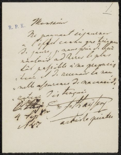 Curator: This work, “Kwitantie voor Christiaan Kramm” by Pieter Christoffel Wonder, possibly from 1824, is quite intriguing. It’s an ink drawing on paper. The immediate impression is that it’s just an old receipt, but that script has a certain artfulness. How does it strike you? Editor: It feels like a practical document elevated by its presentation. It's essentially a receipt but it’s got these flourishes to the script and interesting use of negative space. What's the story behind turning something so mundane into art? Curator: Exactly. Think about the role of patronage at the time. Wonder, to support himself as an artist, might have provided services like creating beautiful receipts for clients. This is more than just accounting; it's about visually reinforcing the transaction, associating trustworthiness and artistry with the Kramm name. What does that suggest about the cultural value placed on financial transactions then, do you think? Editor: I guess it implies transparency and integrity were highly valued and visibly displayed through this artful record. A beautifully handwritten receipt suggests care and professionalism. So it reflects the expectations of the patron in the context of the art world? Curator: Precisely. Consider the political and economic stability needed for such flourishes to be appreciated. The choice of script, the careful layout, all speak to a societal expectation of elegance and honesty in even the most basic financial dealings. Were these the values of a new merchant class trying to assert power? Editor: So, something that looks straightforward is a window into social values and even economic power dynamics. It makes you wonder what today’s version of this might look like! Curator: It certainly gives you a lot to think about how we use everyday documents. Editor: Absolutely. I’ll definitely be looking at receipts differently from now on!