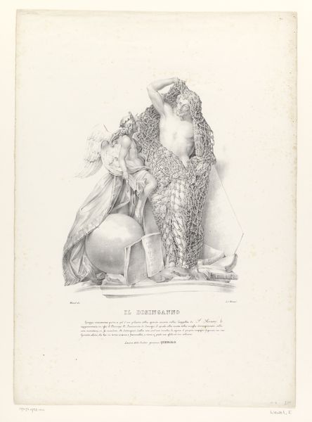 Curator: Here we have an engraving, probably made sometime between 1835 and 1855, after a marble statue by Francesco Queirolo in the Capella di Sansevero, Naples. It's titled "Prince Raimondo di Sangro disentangling himself from the net of worldly cares with the help of his winged genius." Editor: Wow. It's heavy, you know? A bit… suffocating, actually. The netting seems so elaborate, but for what? To imprison him, and visually imprison us in its details? Curator: That net, you see, is an incredibly potent symbol. It signifies the "worldly cares" that bind us. Think of desires, anxieties, the fleeting nature of material possessions—all those things that can tangle us up if we’re not careful. And the figure of the winged genius helping him? Editor: Ah, the get-out-of-jail-free card? An almost angelic form providing assistance... or is it merely urging him on? His face… he looks torn. The statue presents so much emotion within those few lines and shapes. Curator: Exactly. The genius represents intellect, reason, the higher self pulling the Prince toward enlightenment. Consider this piece in the Neoclassical style. Neoclassicism looked back to ancient Greece and Rome for its artistic inspiration, embracing concepts of order and morality. Editor: So it’s not just an artistic exercise but a moral lesson. I can sense the weight of responsibility in the prince's figure, the struggle, you can practically feel him gasping to free himself from it. Curator: And see the sphere they are positioned on, supporting them, this highlights the Earth as a temporal cage that the man hopes to be released from with the help of his guiding genius. It encapsulates that constant tension between our earthly existence and our spiritual aspirations. It is almost reminiscent of Prometheus unbound by Zeus but rather the world in this depiction. Editor: I see that. It brings to mind personal responsibility within a wider spiritual experience, a real desire to cast away chains holding one to terrestrial burdens. Well, it's certainly left me pondering which nets I need to untangle myself from! Curator: Indeed. An image with remarkable staying power that reveals humanity’s ongoing reckoning with life's enduring struggles.