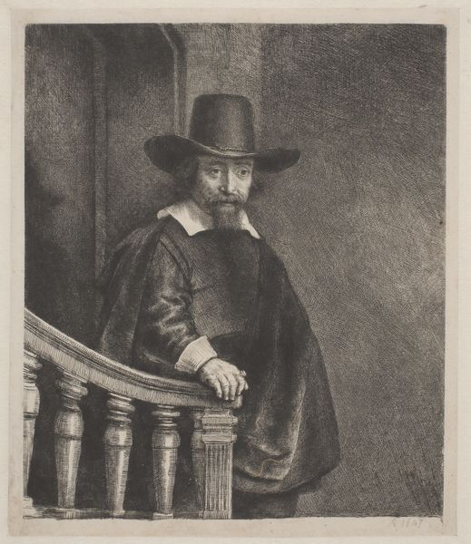 Editor: So, here we have Rembrandt van Rijn's "Ephraim Bonus, Jewish Physician" from 1647, an etching. It’s a very striking portrait. What I find interesting is how the light almost seems to emanate from the subject. How do you see it? Curator: I see it as a potent example of how the burgeoning Dutch Republic used imagery to define itself. Rembrandt, positioned within this complex socio-political landscape, was very aware of how his art functioned in the public sphere. Notice the controlled use of shadow. What might that imply about the society he's portraying? Editor: Hmm… A society perhaps interested in portraying only certain aspects of reality? A need to be selective about who is worthy of being represented in the light? Curator: Precisely! Think about the role of Jewish physicians within Dutch society at that time. They held a unique position, often bridging cultural divides, yet subject to specific social regulations. Rembrandt’s etching brings visibility, offering a complex character study but also navigating the unspoken rules about portraying minority figures. How does this play into our modern museum environment? Editor: That makes me consider our role as curators. How do we unpack these complex histories without reinforcing potentially biased portrayals? Curator: Exactly! We must question the context, interpret the cultural nuances, and then actively use our platform to start critical dialogues. Editor: I see, understanding not just what is shown but what the artist subtly suggests about the person within their societal role is crucial. It makes you question our own position in perpetuating these stories. Curator: Indeed, our interpretations shape narratives that are always evolving, reflecting on our understanding of social structures through time.