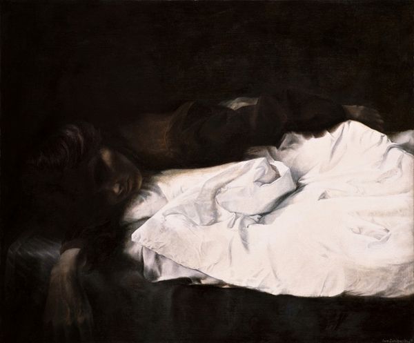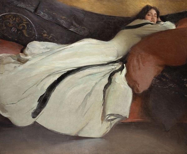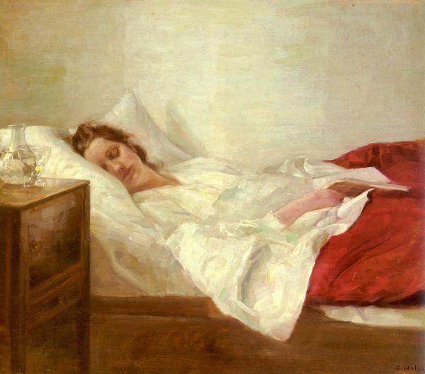 Curator: My first reaction is just how unnervingly peaceful this is. Editor: You’ve certainly pinpointed its paradoxical effect! We’re looking at “Desdemona,” an oil painting crafted in 1892 by Rodolfo Amoedo. The stillness you perceive sits heavily on the impending tragedy. Curator: Impending? I felt as though the tragedy has passed. There is an acceptance to her posture, as if, finally, there is peace. Does that resonate within the structure of the image? Editor: Very astute. Formally, it’s a fascinating exercise in contrasting textures and colour. The stark white sheets, juxtaposed with the ominous shadows that loom around her, speak volumes about innocence meeting a grim fate. Note the academic precision, the very controlled brushstrokes. It's as though Amoedo is building a perfect tableau of loss. Curator: The colour palette just seems to vibrate! That muted red background…almost like dried blood under stage lighting. I get the need to present "loss", but what else might the work represent beyond a snapshot from Shakespeare? The light falling upon her face almost evokes religious iconography. Editor: An astute point about colour, which enhances narrative. The pre-Raphaelites definitely used that to amplify themes and dramatic ironies, to make paintings "speak" directly to viewers in the language of colour and emotion. Your note about the religious evokes its aesthetic purity which could imply a "martyr". Her death as sacrifice of some kind? Perhaps, Amoedo is painting a reflection on female vulnerability and victimization, the tragic destinies woven into the narratives of women, not just in Shakespeare but in a patriarchal world. Curator: Absolutely. It does raise many contemporary conversations as to why those paintings, specifically the historical portrayals are interesting in today's art context. Editor: Indeed! Thank you for your illuminating perspective. These artworks are still being interpreted in new ways because our culture evolves constantly and we approach things from the vantage point of now, don't we?