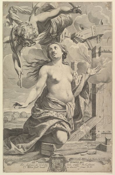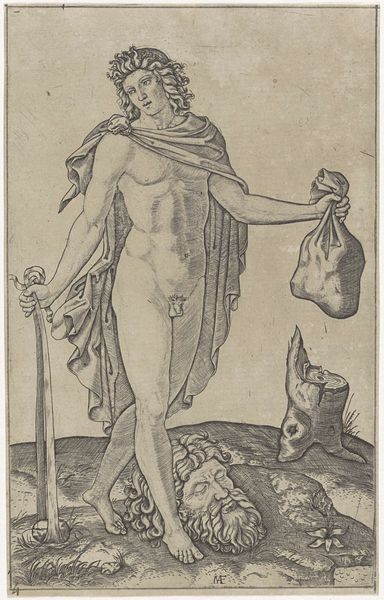 Agostino Veneziano created this engraving, *Cleopatra*, around 1515-1516. The composition presents a lone female figure standing within a niche, yet what unsettles is how it prompts us to question conventional notions of identity. The semiotic system at play invites one to deconstruct fixed meanings: Cleopatra is represented nude but for a snake coiled around her wrist, an explicit symbol that speaks to a powerful, dangerous queen. Veneziano destabilizes the narrative by inscribing 'ISIS' in the upper-left corner, therefore challenging the singularity of the image and blurring the distinction between identity, cultural memory, and artistic representation. Beneath her foot, he includes the inscription 'BACIO . DI . DANTE,' further layering interpretation. The artist doesn't merely represent Cleopatra, but places her within a matrix of cultural and historical allusions, allowing us to reconsider the established frameworks of meaning.