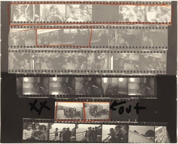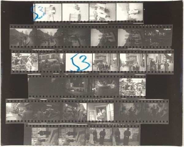 Editor: Here we have Robert Frank’s "Paris 51B", a gelatin silver print from 1951-1952. The image is of several film strips, and it gives such an interesting glimpse into Frank's photographic process, especially with the markings on the strips. I am really curious how this relates to Frank’s wider artistic vision. How do you interpret this work in relation to its historical context? Curator: Well, seen through a historical lens, "Paris 51B" offers more than just a peek into Frank's workflow; it reflects the socio-political currents of post-war Europe. The presentation of the film strip as the artwork itself challenges the traditional notion of a ‘finished’ photograph. Consider how museums and galleries usually present photography; carefully selected images, beautifully printed and framed. Editor: Right, it’s so raw in comparison. Almost anti-establishment. Curator: Exactly! It's a deliberate unmasking. We are shown the selection process. The blue and red markings aren't accidental; they signify a dialogue, a decision-making process that typically remains hidden. What do you think that reveals about Frank's relationship to his subject matter and audience? Editor: I guess it humanizes the artistic process, doesn't it? Showing the messy reality behind the final, polished product. The street scenes themselves seem very candid too, capturing fleeting moments of everyday life in Paris. Curator: Precisely. Frank, through this presentation, invites us to question the curated reality often presented by institutions. How complicit are museums in shaping our understanding of photography and history itself? Are they offering truth or just one version of it? Editor: That's a perspective I hadn't fully considered. So, the photograph itself, and its presentation, become a commentary on the role of art institutions and the power they wield. Curator: Precisely. It encourages critical engagement with the images we consume and the systems that present them. Hopefully our discussion helps underscore that intent.