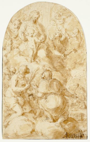 Editor: Here we have Johann Georg Bergmüller's 1726 drawing, "The Holy Angels Protecting a Hermit from Evils," rendered in charcoal. The ethereal quality is captivating, almost dreamlike. I'm curious about the history and what it represents to viewers of the time. What do you see in this piece from your perspective? Curator: I see a potent articulation of the relationship between the individual and divine authority, specifically how artistic representation bolstered the power of the Church. Look at the composition; it presents a clear hierarchy, from the vulnerable hermit below to the dominating angels and the all-seeing eye at the apex. Consider the socio-political function of such imagery during the Baroque period: the visual assertion of divine intervention reinforced societal structures. Editor: So it's more than just a religious scene, it is social commentary? Curator: Precisely. The image served as a didactic tool, visually encoding acceptable behaviors and belief systems. Bergmüller leverages the dramatic possibilities inherent within baroque aesthetics to present a visually compelling argument for adhering to established religious doctrine. How do you perceive the hermit's posture within this framework? Does his vulnerability serve a narrative purpose? Editor: It definitely makes him a figure needing protection. It really drives home that dependence on the Church. I didn’t initially see that layer of meaning. Thanks. Curator: It's about understanding how institutions and art production became entwined. Bergmüller was employed in an environment, full of cultural context and how images were intended to be consumed, further understanding their significance within its time.