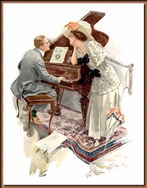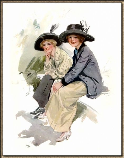 This is a painting by Harrison Fisher who lived in America at the turn of the century, we can see that it was most likely created with traditional materials. The artist's rendering of the fabric gives us an insight into the labor involved in producing the garments and furnishings of this period. Look closely, and you'll see how the material influences the overall appearance of the composition, its inherent qualities of texture, weight, color and form. This would have involved a huge amount of labor, and in turn makes an artwork that conveys social and cultural significance. Paintings like this give us insight into the huge amount of work that has gone into the production of clothes in the industrial era, and encourages us to value the time, skill, and energy involved in creating the material world around us.