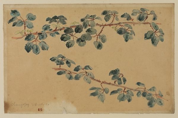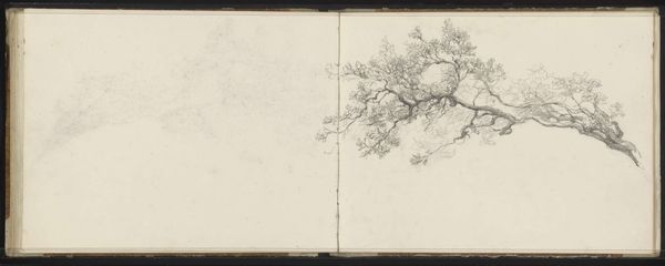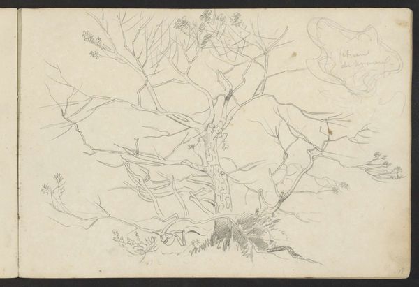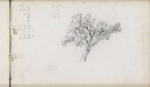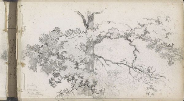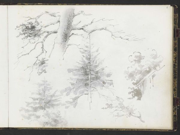 Editor: We're looking at "Vier bomen op een rij," or "Four Trees in a Row," created sometime between 1834 and 1903 by Johan Hendrik Weissenbruch. It’s a pencil and colored pencil drawing at the Rijksmuseum. It feels very raw and immediate, like a quick sketch from nature. What story do you think it tells? Curator: This drawing provides an intriguing insight into the artist's working methods, especially within the context of 19th-century Dutch landscape painting. Weissenbruch, a key figure of the Hague School, was deeply invested in capturing the specific atmosphere of the Dutch countryside. Do you notice how the composition avoids the picturesque or grand vistas that were often favored in academic art? Editor: Yes, it feels much more intimate and personal. Like a study rather than a finished painting. Curator: Precisely! The sketch highlights the everyday. Its value lies less in idealized beauty and more in representing a specific locale. What do you think was the social role of this shift towards realism in landscape art? Editor: Was it about making art more accessible, moving away from these grand paintings only the wealthy could relate to? Curator: Exactly! Artists like Weissenbruch were, in a way, democratizing the landscape. They presented images of a nation to itself, emphasizing familiar and local imagery, connecting people to their immediate environment rather than some romanticized vision of nature. It allowed art to reflect and shape national identity. Editor: That makes so much sense! I'd never considered the political dimension of landscape art before. Curator: It's a subtle but powerful force. This sketch offers a fascinating window into how art, even in its seemingly simplest form, plays a role in shaping cultural perceptions and national narratives.