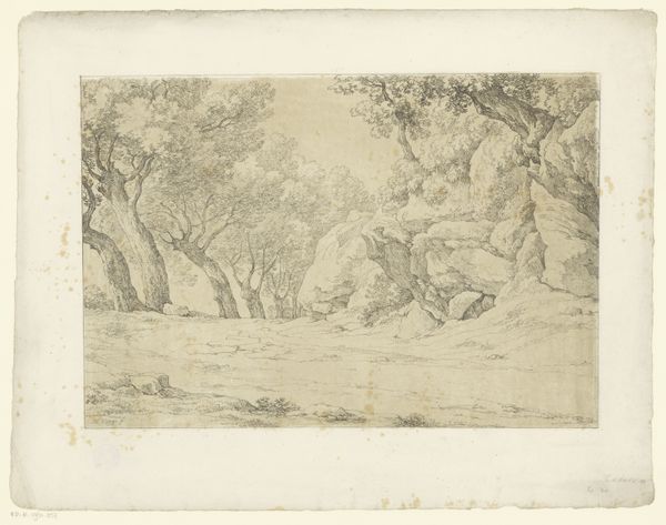 Curator: Charles Jacque's "Dessous de bois à Noisy," created around 1860 to 1864, presents us with an intriguing landscape rendered through the medium of etching. It's currently held in the Städel Museum. Editor: This is striking! It feels so immersive, as if you could just step right onto that sun-dappled path. It almost has a secret, storybook vibe to it, don't you think? Curator: Indeed. Notice how Jacque masterfully manipulates light and shadow. The dense foliage, achieved through intricate linework, creates a complex interplay of tonal values. This serves to both obscure and reveal, drawing the eye deeper into the composition. Editor: The contrast really grabs you. The starkness between the foreground, shrouded in those intricate, dark details, and that glimmer of bright clearing at the center—it's almost like hope filtering through chaos. Am I reading too much into a forest path here? Curator: Not at all! It speaks to a tenet of Romanticism. Jacque is invoking an emotional response through his detailed observation and his compositional technique. Observe also, how the pathway directs your eye using linear perspective, creating depth, but, more significantly, acting as a compositional armature. Editor: It really does. It leads you right into the unknown. And yet there’s something so inviting about it all—the play of light on the path, the implication of further scenery concealed just beyond view. Curator: We can certainly interpret it that way, yes. Consider as well the textures conjured using etching techniques—a method involving the use of acid to cut into the metal plate, allowing for fine lines and dense cross-hatching, evident here. Editor: You know, staring at this intricate web of lines, I keep thinking how much nature is about patterns, about hidden structures. Jacque really managed to get at the beautiful order within seeming wildness. It is quite compelling to observe that quality throughout this print. Curator: It reflects the artistic preoccupations of the period, to accurately depict not just visual reality but its emotional equivalent—and in a manner faithful to material processes. Editor: And he has done that expertly, wouldn’t you agree? Curator: Absolutely, I see the Romantic sentiment vividly evoked by the hand of Charles Jacque. Editor: This piece invites one to stroll, to linger, to become immersed. Bravo, Monsieur Jacque.