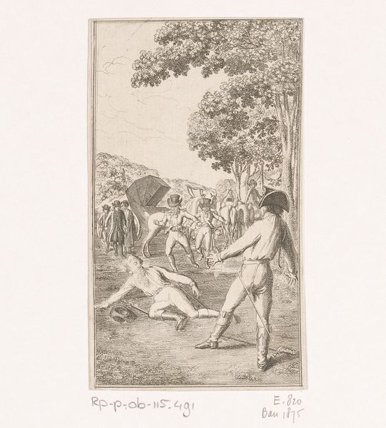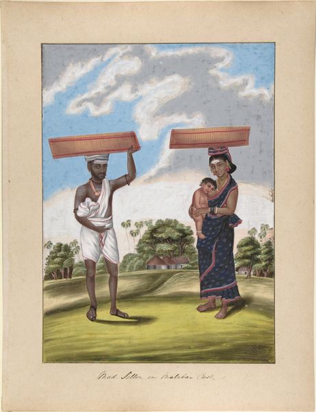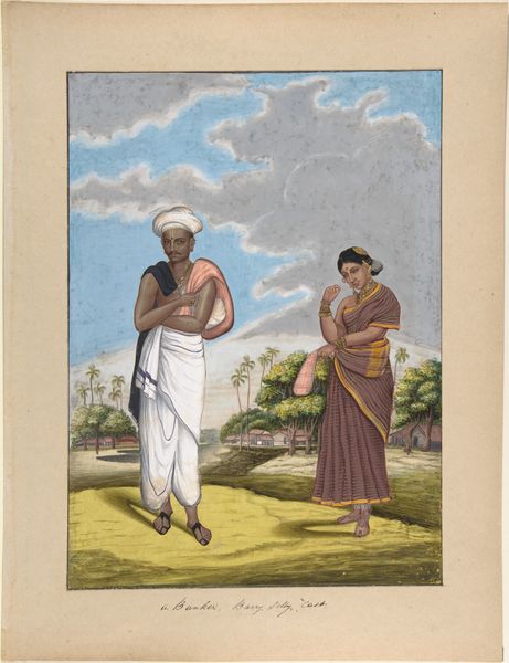 This painting, titled "Dugler, from Indian Trades and Castes," is an anonymous work on paper. The composition immediately draws your eye to the figures set against a simplistic backdrop of land, sky, and distant dwellings. The artist uses distinct color contrasts to separate the figures from their environment. Notice the man holding a bird, his body adorned with sparse clothing, and the woman swathed in white cloth. These figures are set against a horizon line that flattens the perspective. The way the artist defines space and form reflects a unique understanding of representation, one that diverges from Western conventions of perspective. This challenges our expectations. The painting provides insights into the social structures of its time. The flattening of space and the careful detailing of the figures invite us to consider how representation itself can be a form of cultural encoding, reflecting and reinforcing particular ways of seeing and knowing the world.