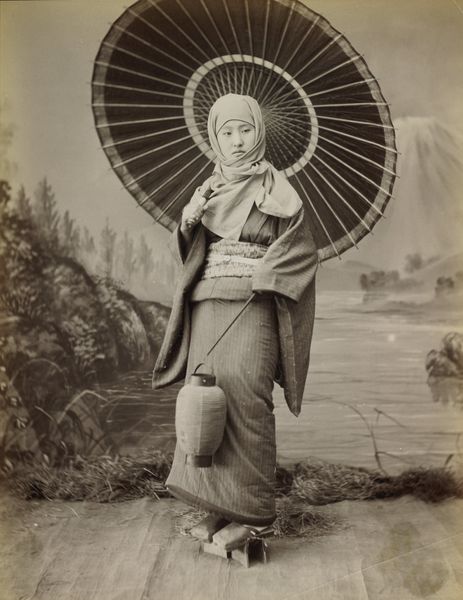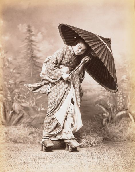 Curator: This hand-colored albumen print, attributed to Kusakabe Kimbei, is titled "Japanese Peasant." It’s part of the Harvard Art Museums collection. Editor: What strikes me first is the juxtaposition of the heavy burden against the delicate blossoms she carries. There’s a profound contrast at play. Curator: Indeed. The firewood she carries speaks to the labor and social context of the time, while even the flowers themselves become symbols within this staged reality. The photographer and the model are collaborating on a constructed narrative. Editor: It's intriguing to consider the staged aspect. Are we meant to see a romanticized version of labor, or is there a deeper commentary on the role of women in this society? Perhaps both? Curator: Perhaps. The very act of photographing, of creating this image for consumption, shifts it from simple representation to a complex artifact imbued with power dynamics. Editor: Absolutely. And that transformation affects how we view her. I wonder, in seeing this image, what cultural ideals and biases are also being carried on our own backs?