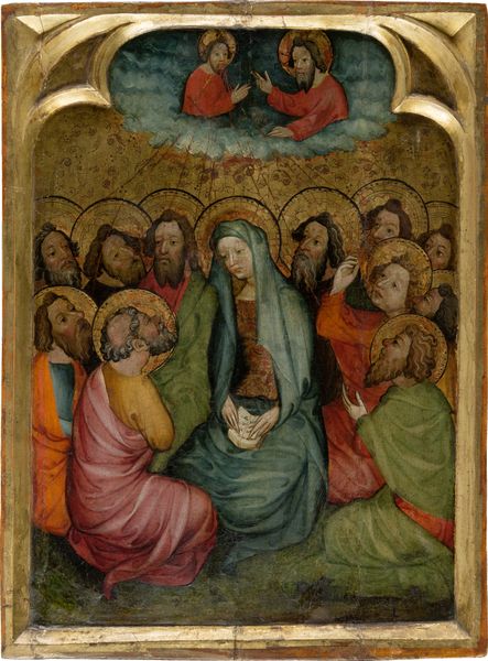 Curator: The work before us, tempera on wood, dating from 1325 to 1335, is titled “Annunciation and Nativity.” It's attributed to an anonymous artist, now held in the collection of the Städel Museum. My immediate impression is that the dual scenes, one above the other, give it the feeling of a medieval illuminated manuscript page blown up to a larger scale. Editor: It feels incredibly intimate, even naive, but it evokes a tenderness. The rendering of the figures, almost doll-like, gives a soft, nurturing impression. Curator: The dual scenes compress time, don't they? Above, we see the Annunciation with Gabriel delivering news to Mary, rendered with typical iconic symbolism: a dove, the Holy Spirit, descends, and the angel’s scroll. Below that unfolds the Nativity. The animals' heads are almost comical, peering from behind a very boxy, geometrically rigid manger. Editor: And that compressed timeframe speaks volumes about medieval life, how quickly one stage transitions to another, and the lack of autonomy for women then. Mary goes from receiving monumental news to immediately fulfilling that destiny, devoid of modern considerations of choice or preparation. The flattened space intensifies that pressure, no room for pause. Curator: Exactly. Space itself functions symbolically here. Gold backgrounds collapse spatial depth to focus attention on the sacred drama. It's an iconic flatness designed to evoke contemplation. Even the ox and donkey symbolize the Jewish and Gentile people, according to some interpretations. They literally witness the Divine. Editor: Right. Consider also the gendered labor visible. Joseph looks burdened with the construction, building a humble space even as Mary holds the baby. It represents very clearly divided labor roles, something very fixed in the 14th century. Curator: And the flowers, do you notice them in the vase? Representing Mary's purity, almost impossibly growing within what should be an interior space? Every detail reverberates with encoded religious meanings that formed the spiritual reality of the time. Editor: Seeing it through today’s lenses lets us engage with both this profound legacy and the social constraints that were also embedded. Artworks are products of their time as much as they are responses to it. Curator: Well put. It’s remarkable how so much symbolism is packed within this relatively small artwork, creating something both devotional and revealing of the cultural assumptions of its era. Editor: Yes. Hopefully these initial reflections enhance everyone’s engagement, enabling them to view with richer context.
