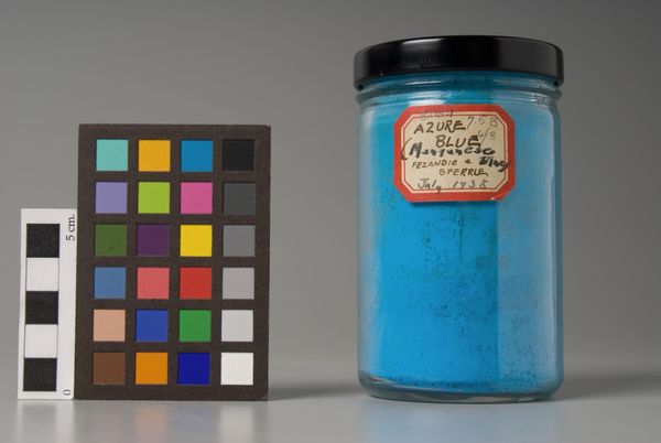 Curator: What strikes me immediately is the sheer vibrancy of that cobalt violet pigment. Editor: Indeed. We’re looking at a jar of “Genuine Cobalt Violet,” produced by Fezandie & Sperrle, with a label dating it to May 1936. It's a fascinating insight into the industrial production of artists' materials. Curator: Absolutely, and cobalt violet, despite its beauty, was notoriously expensive and difficult to produce. Its appearance signaled a certain level of affluence for the artist using it. Editor: The jar itself speaks to the commodification of art—pigment reduced to a product, neatly packaged for consumption. It makes you consider the labor involved, from mining the raw materials to the factory floor. Curator: It’s a testament to the changing landscape of art production in the 20th century, moving away from handcrafted pigments to mass-produced colors. Editor: Exactly. Examining something as seemingly simple as a jar of pigment opens up questions about the social and economic forces shaping art. Curator: It gives a concrete look at the materials that made art possible. Editor: Quite so. A reminder that even art has humble, material beginnings.