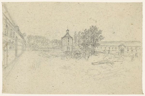 Curator: Before us, we have Georges Michel’s “Weg aan de rand van de stad,” created sometime between 1773 and 1843. The work, a plein-air drawing, employs both pencil and pen and ink. Editor: It feels like a memory, fading at the edges. Kind of wistful, you know? A quiet road, maybe a little lonely. The sketchy quality adds to that feeling, like it’s more impression than reality. Curator: The aged paper substrate becomes integral to the work. Observe how it enhances the sense of temporality. The medium is essential to grasping the art historical context. Michel positions himself firmly within Romanticism's exploration of emotion and nature. Editor: True. But also, there’s something almost rebellious in its simplicity. All those grandiose Romantic landscapes, and then you get this… tiny, unassuming sketch. Like, “Yeah, nature’s great, but what about the bit just outside town?” I like that contrast. Curator: The formal aspects also support this subversion. Note how the lines, though delicate, delineate space—how they generate spatial logic using structural arrangements. Editor: Those sketch lines—they really get the imagination going. You almost feel like you could add to it yourself, complete the picture, fill in the story. It’s very…inviting, in a way that a polished landscape sometimes isn't. Curator: And consider how the technique—rapid, assured strokes—suggests not merely depiction, but analysis, conveying transient atmospheric conditions. There’s even a pre-Impressionist sensibility, avant la lettre. Editor: So, a glimpse into a fleeting moment then, caught on paper. A moment on the edge of town that asks to consider the overlooked and question the spectacle. That’s powerful, in its own small way. Curator: Indeed, the material construction itself creates this sensation. We leave with new questions, rather than answers. Editor: Makes you want to grab your sketchbook and find your own edge of town, doesn't it? See what stories are waiting there.