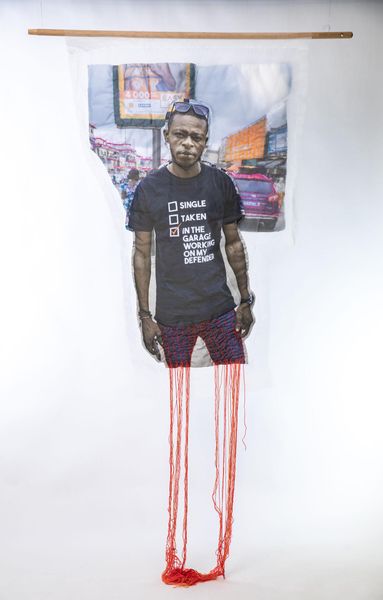 Editor: So this is "You Talkin' to Me?" by Joana Choumali. The dimensions are pretty substantial. I'm struck by the contrast between the photographic image and the flowing threads at the bottom. What do you see as the most compelling formal aspects of this piece? Curator: The superimposition of the photographic image upon the textile is key. Observe how Choumali complicates the surface by introducing contrasting textures, from the smooth photographic print to the tactile, flowing threads. Editor: Interesting. The threads do add another dimension, literally and figuratively. I wonder what the artist's intentions were by including them? Curator: Perhaps the threads serve as a deliberate deconstruction of the photographic image, questioning its supposed fixity and inviting a more fluid interpretation. Editor: I never thought of it that way. I appreciate the new perspective! Curator: A close consideration of form often opens new avenues for interpretation.