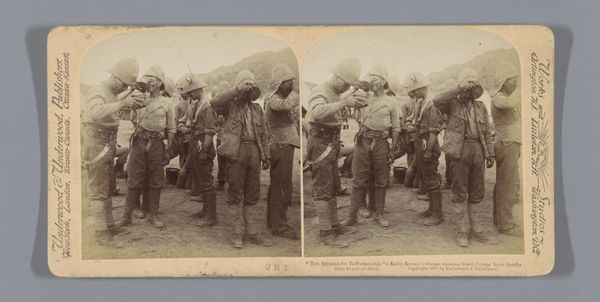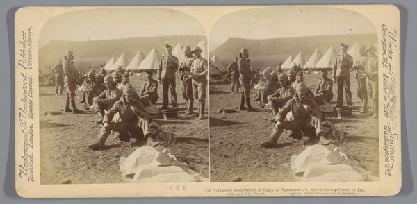 Editor: Here we have a gelatin-silver print from 1900 titled "Britse soldaten bereiden rosbief op kerstdag, Modderrivier, Zuid-Afrika" – that’s "British Soldiers Preparing Roast Beef on Christmas Day, Modder River, South Africa" – by an anonymous photographer. It looks like quite the austere Christmas feast amidst a desolate landscape. What strikes you about this image? Curator: Ah, a poignant snapshot of Empire, wouldn't you say? The desolation contrasts sharply with the ritual of Christmas, hinting at both resilience and a kind of tragic isolation. Observe how the soldiers, uniformly dressed, are meticulously preparing this rather enormous roast, carving into what looks like…well, it was once a cow. It’s like a still life interrupted by war. What feelings does the contrast evoke for you? Editor: I hadn't thought about it that way, but it does seem deliberately composed to make the landscape itself a character, and that feeling of isolation really does pervade it. What do you make of the composition? Is there symbolism beyond the obvious juxtaposition? Curator: I find myself wondering about the stories behind those faces - so very obscured by their hats - you can only see fragments. Who were they missing? Were they thinking of family? The way the line of figures stretches into the distance…it almost mimics the unending nature of war itself, stretching onward, eating away at one's soul! Makes you think, eh? Editor: It does, profoundly. It also underscores how a single image can simultaneously celebrate and question historical narratives. Curator: Exactly! Photography isn't just about documenting; it’s about asking, probing, and whispering hidden histories back to us from the ether of time! That makes you hungry for more understanding.