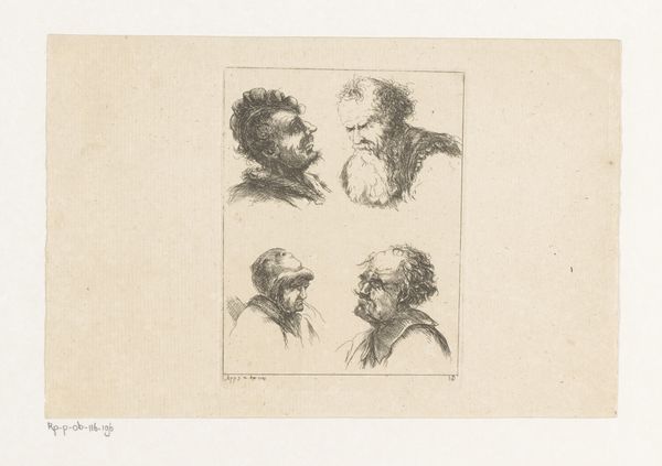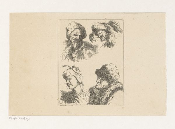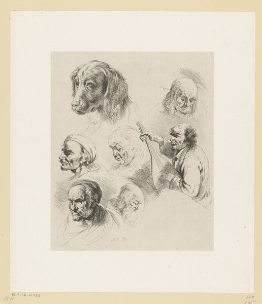 Editor: This is "Zeven portretstudies," or Seven Portrait Studies, by Gustave Buschmann, dating from 1828 to 1852, rendered in ink on paper. It has a spontaneous quality, almost like sketchbook pages combined on a single sheet. What stands out to you about the piece? Curator: Let's consider the labor embedded within. Look at the detail achieved through the application of ink; Buschmann's process reveals an understanding of material transformation. Ink, an easily reproducible commodity, here elevates seemingly ordinary paper into a platform for careful observation. Editor: I see your point about labor. The sheer number of studies does suggest focused dedication. How does this impact its role in Romanticism or Academic art? Curator: Absolutely, by meticulously deploying these readily available materials, Buschmann democratizes art making, echoing a shift towards recognizing craft, traditionally separate from high art. Editor: Interesting. So the social and economic implications of materials challenge these artistic categorizations? Curator: Precisely! What were the cultural uses of drawing within the Academic framework, especially regarding portraiture, and to what ends were Buschmann’s skills applied? Did it empower social mobility, even symbolically? Furthermore, Romanticism often idealized folk craft traditions. Here, industrial production enters artistic vision, complicating idealized historical craft, thus blurring previously maintained categories of social class. Editor: That's a perspective I hadn't considered. The deliberate act of selecting ink, processing it into meaningful marks... Curator: Exactly. How does that repetitive execution affect your appreciation of Romantic and Academic-Art expectations? Editor: I see it creates tension; while subjects reflect classical ideals, material reality shifts away from the sublime into the realm of everyday access. Curator: I'm glad to have had this conversation with you, exploring Buschmann's work through this perspective has broadened my appreciation as well. Editor: Thank you! I'm leaving with fresh questions about the social role of artistic materials during that time.