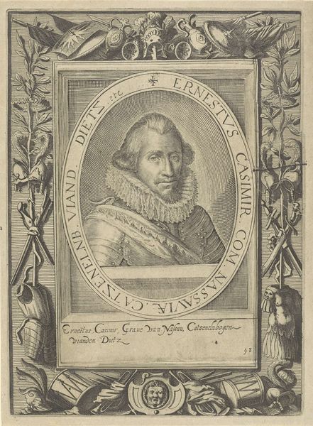 Balthasar Florisz. van Berckenrode created this engraving titled "Portret van Charles-Bonaventure de Longueval, graaf van Bucquoy" which captures the likeness of a prominent military figure. As a portrait it embodies the identity and status of its subject. It reflects the social hierarchy of the 17th century where portraits were often commissioned by the elite to project power and prestige. The intricate details of Charles-Bonaventure’s attire, the symbols of military might, and the Latin inscriptions, all contribute to constructing an image of authority and nobility. Looking at this portrait, I'm reminded of the power dynamics inherent in representation and the ways in which individuals are immortalized through art, often reinforcing existing power structures. It also invites us to reflect on the relationship between the sitter, the artist, and the audience in the construction of identity. It acts as a time capsule that encapsulates the values and aspirations of a bygone era.
