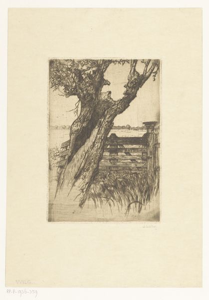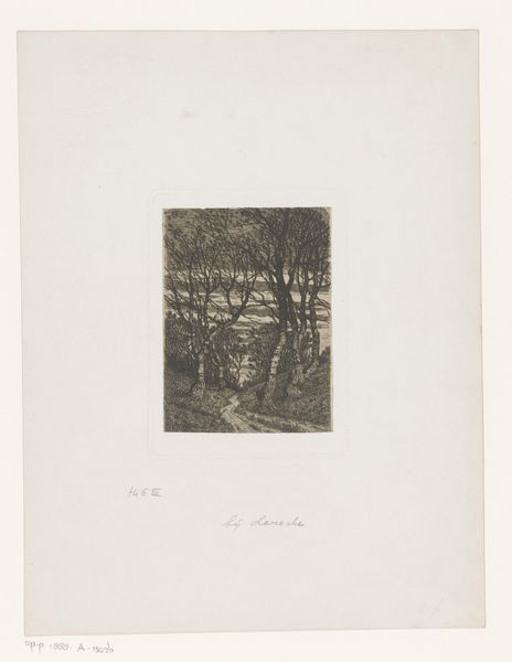 Curator: What we have here is Jean Pierre François Lamorinière's "Row of Poplars on the Shore of a Lake." It's an etching, dating from somewhere between 1838 and 1889. Editor: The immediate impression? Quiet. There’s a stillness in the water, in those trees. It almost feels… melancholic? Curator: The stillness you perceive is created by the linear quality of the etching itself. Notice how the repeated, precise lines used to create the trees almost mimic the uniform trunks themselves. It feels very considered. Editor: True. And it makes you wonder, doesn’t it, about the availability of printmaking materials at the time? An etching meant a copper plate, the acid… it’s a far cry from quickly snapping a photo. There's inherent labor involved, even a democratic dispersal of the artwork possible because of prints. Curator: Absolutely. The act of creating, that dedicated labour, adds another layer to the stillness. This isn't just a landscape; it's a captured moment prolonged through the artist's focus. The scene becomes a repository of the artist’s—and perhaps our own—meditations on nature. I like the effect of how the row of the slender poplars and the reflections become one in the center; is it the reality or just the reflection we perceive as truer in our minds? Editor: The monochrome helps, definitely creating more somber reflections of nature. But that linear repetition… does it add or detract from that original sense of stillness we first noted? It’s nature filtered, carefully arranged. Does it represent, in your opinion, access to nature limited to the privileged who acquired these prints to admire? Or, since there would be multiple copies due to the production method, a wide reach? Curator: It does both. Yes, prints were often acquired as status symbols of cultural awareness, demonstrating aesthetic interests to society; on the other hand, more prints existed overall for the art to travel from person to person. A single owner doesn’t exist for a copy of prints. Editor: Indeed. Seeing this piece from the Rijksmuseum collection—reflecting on the resources needed for its production—makes one consider not only art history, but also the history of labour and access embedded within this quiet landscape. Curator: Exactly! This landscape makes you consider, makes you imagine a conversation with its maker and what matters and moved the artist while carefully laboring and arranging.