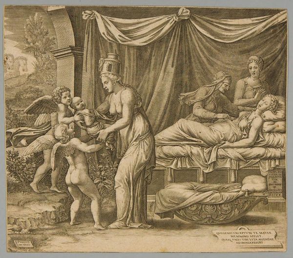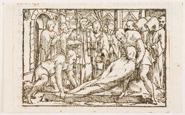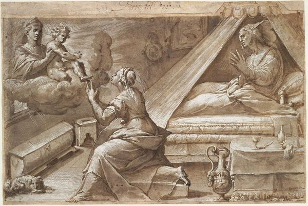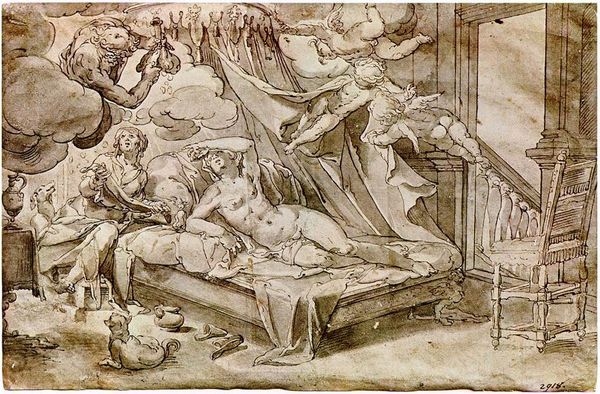 Curator: The textures in Andrea Mantegna’s "Mythological Scene, Metamorphoses of Amymone," created around 1500, really capture my attention. It has such a stark presence. What is your first impression, Editor? Editor: Honestly, I find it a little unsettling. It has this dreamlike yet harsh quality—the way everything is so sharply defined gives it a strange, almost unsettling feel. The figures are so still and frozen. What about the material aspects strikes you? Curator: Knowing this is a drawing meant to mimic carving tells me Mantegna was clearly thinking about the value associated with particular techniques. This subverts expectations, almost playfully—suggesting he might have been consciously undermining art hierarchies of the period. Editor: I can appreciate the craftsmanship, but all I see is an uncanny valley. The artist’s trying to depict beauty, yet the sharp lines, the forced stillness... it leaves me a little cold. Perhaps he wasn't intending to evoke a sentimental emotional response, maybe something more intellectual. It definitely makes you think about artifice. Curator: Precisely. Mantegna also played around with the viewer's own expectations regarding classical mythology. The female figure being surrounded by these figures suggests her vulnerability within patriarchal narratives, all part of the stories that were designed and consumed back then. Editor: Absolutely, and considering this era was transitioning from religious dogma toward humanism makes me consider Mantegna himself and wonder what position he inhabited on that axis. But more than any symbolic depth, I am fixated on the way he coaxed the image out from essentially bare nothingness using such elemental materials: charcoal or perhaps chalk. This reminds us art need not be ostentatious in its production, its consumption, or its emotional import to affect our understanding. Curator: Exactly. Mantegna used available, familiar materials to present and represent myth and its potential for critiquing a specific socio-cultural condition. Thanks for fleshing this out. Editor: Indeed. A bit dark, but ultimately memorable!