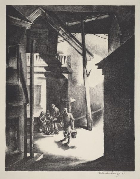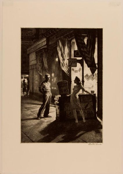 Curator: This is "Little Penthouse" by Martin Lewis. What strikes you first? Editor: It's a mood piece, definitely. Lonely, almost Hopper-esque with the figure framed by the window. The darkness is overwhelming. Curator: Lewis was deeply interested in capturing urban life, especially the experiences of those often overlooked. He lived from 1881 to 1962. Editor: I see a woman, perhaps working class given the setting, almost trapped. The "penthouse" irony is sharp. What are we saying about who belongs where? Curator: The etching captures the stark realities of urban living. The stark light suggests surveillance, doesn't it? Editor: Absolutely. The gaze, the unseen observer... it speaks to power, gender, and the vulnerability of existing within a system built against you. Curator: It prompts reflection, doesn't it? On the unseen lives shaping our cities. Editor: Indeed. A reminder that every space holds layered narratives waiting to be uncovered.