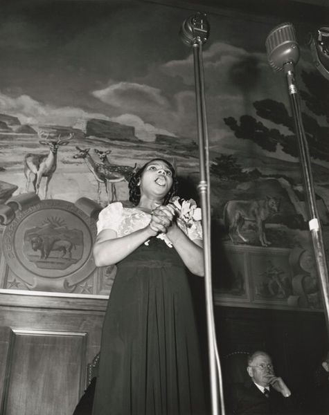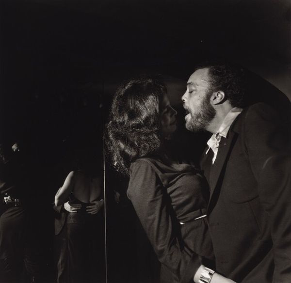 Curator: Elaine Mayes's black and white photograph, "Gloria Gaynor, Long Island" captures the singer in full performance. There's a certain raw energy to it. Editor: The immediate impression is of powerful sound, almost overwhelming the frame. The stark contrast and grainy texture add to that sense of explosive energy. Curator: Absolutely. Gaynor became a cultural icon, especially for the LGBTQ+ community, during the disco era. Her music became anthems of resilience and empowerment. Editor: And we see hints of that symbolism in her pose, her hand raised in what could be a gesture of strength or even supplication, reflecting both vulnerability and power in the public sphere. Curator: The disco ball and the spotlights in the background create a visual language suggesting celebration and collective catharsis. What do you think that says about how we receive images? Editor: It speaks to the power of images to distill cultural moments into symbols. This photograph freezes a moment of shared joy and translates it into enduring iconography. Curator: It makes you wonder about the untold stories within that crowd. A really moving piece, when you consider the broader cultural impact of disco. Editor: Yes, a compelling reminder of how art can capture and amplify the spirit of an era.