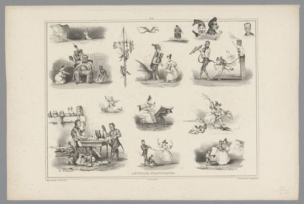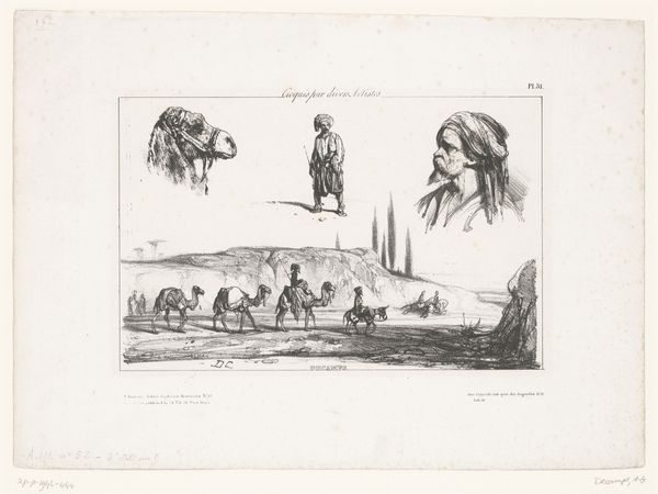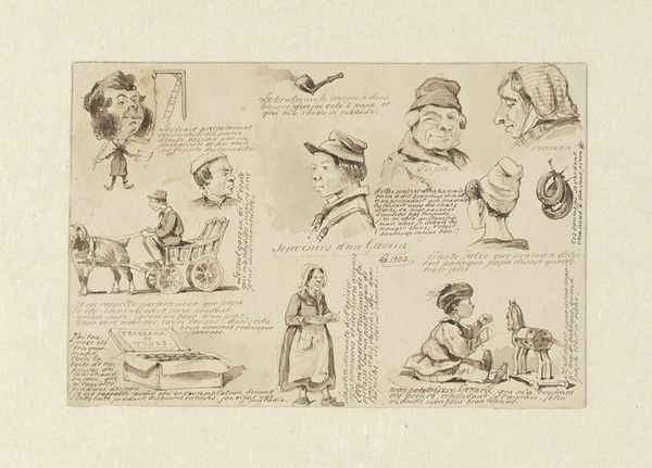 Curator: This is Alexandre-Gabriel Decamps’ “Six Representations of Various Figures and Animals,” made around 1830-1831. The piece consists of several sketches rendered in pen, residing in the Rijksmuseum’s collection. Editor: My first impression is of an artist’s casual visual playground—a space for spontaneous ideas to breathe. I see lines that convey weight, and wonder how Decamps manipulated the pen and paper to make these. Curator: Yes, it feels like peering into a 19th-century sketchbook. What draws me are the recurring motifs. The faces, particularly the prominent man on the top left, hint at societal types that Decamps seems keen on dissecting. His presence resonates with power—but power rendered somewhat comically. Editor: True, but it's the execution that fascinates. The starkness of pen on paper… you can almost feel Decamps pressing down, varying his strokes to imply light and shadow, especially in rendering the textiles. What was the accessibility of these materials? The paper quality? It tells us something about Decamps's position. Curator: I agree that material context is key, but also note the donkey rider's garb versus the dress of the woman in the bottom right—symbols of societal layers, presented together, contrasting cultures and their expectations within shared social spaces. It is fascinating that they remain recognizable today. Editor: Speaking of layers, the arrangement itself suggests a method of cataloging ideas, like notations scrawled rapidly for later development. Was this a preparatory piece? Was it meant for the public or for his personal archive of figures and forms? That dictates so much of its value. Curator: Ultimately, it’s an archive regardless of its intent, containing a record of human expression across centuries. Whether Decamps intended for it to be a private study or something more, these figures mirror back something of ourselves. Editor: And how the means and methods to capture human observation transforms its cultural position too, changing over time to reflect social change. It's not merely the images but also what's at play behind their creation.