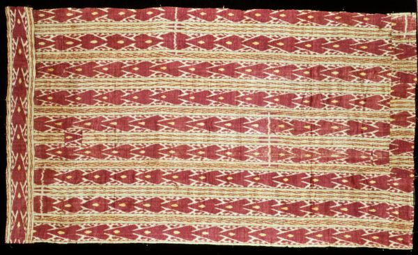Elaborately embellished household textiles are often part of a woman's dowry or given as wedding gifts. These textiles are highly valued within the culture and serve a multitude of purposes ranging from embroidered bed sheets and hand towels to decorative covering fabrics used on everything from pillows and furniture to tea sets and bread baskets. One important group of textiles are the coverings made for the large pillows that are a part of every frash, the typical Moroccan couch. The two coverings shown here were made in the city of Fez, an important artistic center of the country. Traditionally these pillow covers are elaborately embroidered with silk thread by highly skilled artisans resulting in a valued, but costly textile. In the mid-twentieth century hand weavers created woven imitations of this style that are popular with the many people who can't afford the more expensive embroidered covering. (Add photo of pillows) caption: The frash, the traditional Moroccan couch, is often piled with elaborately decorated pillows.