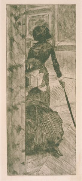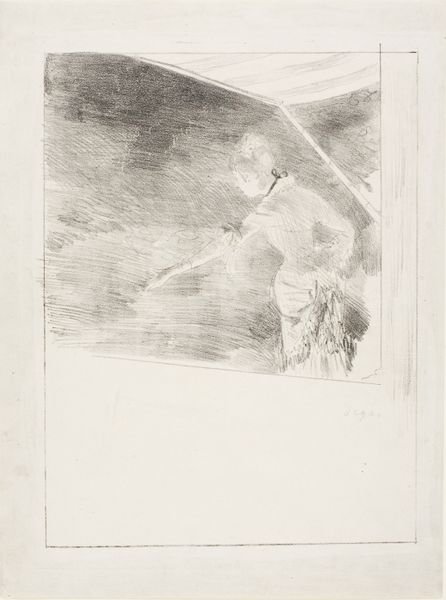 Curator: This is "The Song of the Dog", a lithograph print by Edgar Degas, completed sometime between 1876 and 1877. Editor: Immediately, I’m struck by the heavy contrast, that stark chiaroscuro. It creates a very particular, almost claustrophobic atmosphere, doesn't it? Curator: The interplay of light and shadow is certainly pronounced. Observe how Degas employs hatching and cross-hatching to model the figure and the surrounding space. It's more than mere description; it shapes our perception. Editor: Absolutely. It almost feels like a stage set, with the figure spotlighted, yet isolated within the dense, dark background. What do we know about where it would have been exhibited and seen? Curator: This print, rendered in ink on paper, suggests the artist's deep engagement with printmaking as an art form and as a socially distributed art form in its own right. It challenges conventional notions of uniqueness, by playing with multiplication and the ready availability of images. Editor: I think, as well, this reproduction adds a layer to its socio-political reading: the cabaret singer depicted seems like someone trapped in a spectacle not of her own making. The dog of the title may speak to that. A reference to what she may really think in such circumstances. Curator: It could very well be the public perception of these working women within the framework of Parisian social spaces. The focus on her gestures and expression seems meant to provoke in us a similar gaze to the men in the audience. Editor: In many ways, this seemingly simple print encapsulates complex questions about performance, spectatorship, and the role of women in 19th-century society. Curator: Precisely. Degas allows us to appreciate the semiotic dimensions of this character, without flattening its narrative under any reading in particular. It still stands. Editor: A perfect case for a print's complex layers that can be read and re-read.