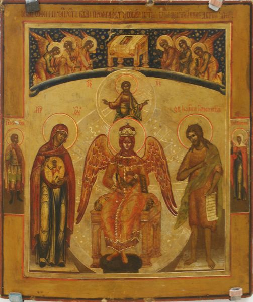 Editor: Here we have an icon titled "The Crucifixion," from around the 19th century, crafted in tempera. What immediately strikes me is the stark contrast between the serene faces and the agonizing scene. What can you tell us about its symbolism? Curator: Notice how the silver-gilt cross dominates the composition? It is more than just a symbol of death; it's a gateway. The figures surrounding the cross, bathed in gentle colors, aren’t just witnesses; they are participants in a sacred narrative, part of a cultural memory passed down through generations. Editor: A gateway... How so? Curator: The Crucifixion, in the iconographic tradition, is not merely a historical event. It is an eternal moment, a sacrifice that transcends time. The artist employs specific visual cues - the weeping sun and moon, the mournful angels – these symbols serve as emotional triggers, drawing the viewer into a spiritual space where personal reflection and collective belief converge. This iconography reinforces communal identity. Does the silver cladding enhance this symbolism? Editor: Absolutely! It elevates the cross, almost as a divine shield or protection. But I also notice the landscape – or lack thereof – it seems intentionally minimized. Curator: Exactly! The stylized setting removes the event from earthly confines, placing it in an ethereal realm. Each element—the colors, the figures' gestures, the architectural fragments—is carefully orchestrated to convey spiritual meaning rather than represent reality. The artist prompts us to consider this. Have our cultures also evolved new symbolic languages? Editor: It’s incredible how this artwork connects individual emotion with cultural narrative, making it more than just a depiction of a biblical event, but a reflection of shared humanity across time. I guess what I will remember is how much shared history can be conveyed in a single symbolic artwork!