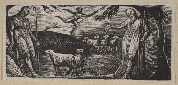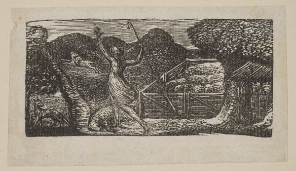 Editor: We're looking at William Blake's etching, "Shepherd Chases Away a Wolf, from Thornton's 'Pastorals of Virgil'," created in 1821. It’s striking how the stark black and white contrast creates such a dramatic scene. What details stand out to you from a formal perspective? Curator: The formal dynamism is certainly compelling. Note the engraver’s burin has produced angular lines which disrupt the possibility of spatial unity. See how the shepherd's flailing pose cuts across the landscape rather than inhabiting it. How might we understand this rejection of pictorial space? Editor: So you're suggesting the composition, instead of creating depth, emphasizes the surface and flatness of the print itself? Curator: Precisely. Consider the shepherd, his exaggerated limbs are not so much those of a defender, but an embodiment of pure energy, the very picture of ecstatic propulsion rendered in stark graphic form. The surrounding forms barely coalesce, so fragmented, in fact, it recalls early woodcuts in their almost expressionist approach to defining tone, light, and form. Editor: It's like the narrative is secondary to the sheer visual force. The lack of shading and defined form directs attention away from pure representation toward…what, exactly? The act of creation itself? Curator: Indeed. This print eschews traditional perspective and mimetic representation. Instead, we observe the inherent qualities of line and contrast – a focus, if you will, on the materiality of art itself. The crude hatching directs the viewer towards recognizing not the represented scene, but a demonstration in applied graphic capabilities. Editor: That's a really fascinating way to see it. I initially saw just a simple scene of protection, but now I see it's a commentary on the potential of printmaking. Curator: My purpose is to always remember that in many works of this era, there is a deeper level to the work in question that escapes the first encounter. Hopefully you, too, have broadened your field of vision for approaching such images from now on.
