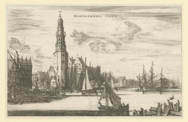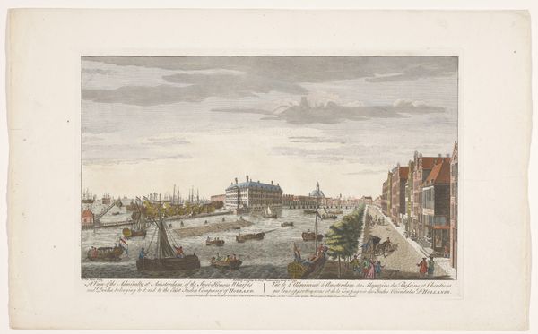 Editor: Here we have Willem Writs' "View of the Nieuwe Brug and Damrak in Amsterdam," an engraving done in 1804. The detail is incredible, and there's such a dynamic interplay between the stillness of the buildings and the movement of the water and the people. How do you interpret this work? Curator: What immediately strikes me is the compositional balance. The bridge, positioned centrally, acts as a horizontal anchor. Writs has masterfully deployed the technique of hatching to create a nuanced tonal range. Notice the meticulous detailing in the architectural rendering and the rigging of the ship, juxtaposed with the less defined, almost ephemeral treatment of the sky. This contrast in texture adds depth and visual interest. Editor: I see that! So you're focusing on how the artist has created different textures to capture different things, like sturdy buildings compared to light clouds. Curator: Precisely. Consider also the linear perspective, directing the eye towards the vanishing point in the background, creating an illusion of depth. Ask yourself, what purpose does this meticulous detail and spatial arrangement serve in constructing meaning within the artwork? Editor: It’s like Writs is using perspective to guide us through the city. Now I'm thinking about how those techniques highlight certain elements. Curator: Indeed. Reflect upon how the formal elements — line, texture, perspective — collectively construct not only the representation of a cityscape but also perhaps a commentary on spatial dynamics. Editor: It's interesting how a seemingly simple landscape becomes a complex arrangement of lines and textures once you start breaking it down. Curator: Absolutely. Art, at its core, is about this sophisticated language, about a system of signs. Our appreciation grows with our ability to decipher its elements.