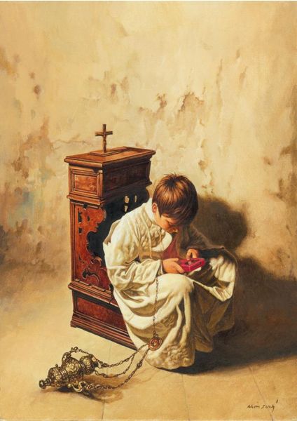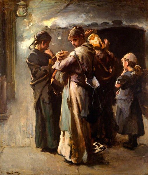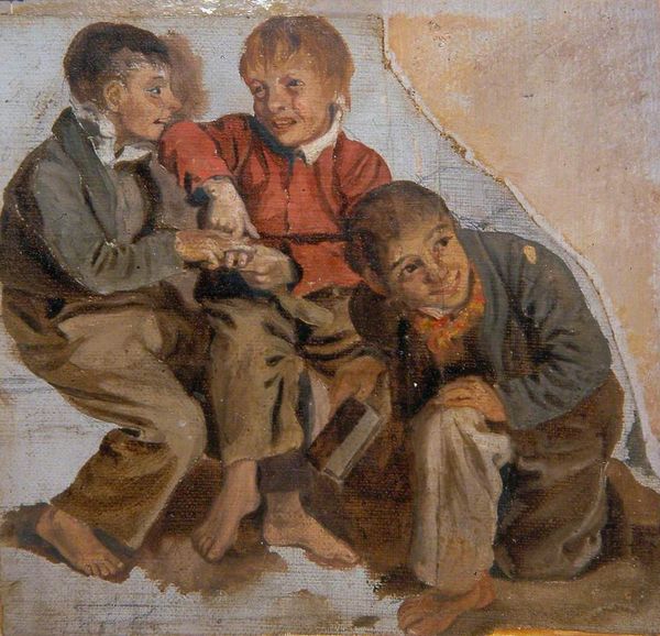 Curator: Arsen Savadov created this painting, "Care," in 2005, using oil paints. What strikes you first? Editor: The limited palette, almost monochromatic. The variations of off-white, red, and drab colors—it gives it an unfinished, sketch-like appearance, yet it feels strangely complete. What do you make of the composition? Curator: It evokes a poignant, almost suppressed narrative. We see children—perhaps siblings, with their toys—looking toward or pleading to someone or something unseen beyond a makeshift partition. Their postures, the light...there's a clear visual metaphor about hope, vulnerability, perhaps even prayer. The setting suggests poverty. Editor: That's interesting. I focused initially on the brushwork—the energetic, almost impatient strokes. They're especially evident in the background and floor, creating a kind of visual instability. Does this inform the feeling of hope you are perceiving? Curator: The rapid brushwork speaks to urgency, a plea or longing for resolution. Considering how children represent innocence, a universal hope for a better future is portrayed. Their upward-reaching hands have resonated across cultures in invocations or supplications. Editor: Perhaps the artist intentionally created this textural ambiguity. A more finished appearance might diminish the raw emotionality. Did Savadov employ symbolism consistently in other works? Curator: Savadov's oeuvre contains motifs relating to displacement, identity, and social change, all presented with his recognizable painting technique, even an unsteadiness. It is likely the partition signifies a larger obstacle; their earnest desire and "Care" become very evocative ideas. Editor: I see that now—the texture amplifies the subject’s psychological reality. Instead of rendering figures hyper-realistically, that raw style of mark-making mirrors inner states of precariousness and longing. Curator: The scene creates its own emotional symbol—one born of brushstroke and hopeful yearning. Editor: A fascinating way the formal elements coalesce around the title's central idea.