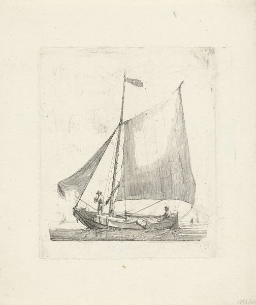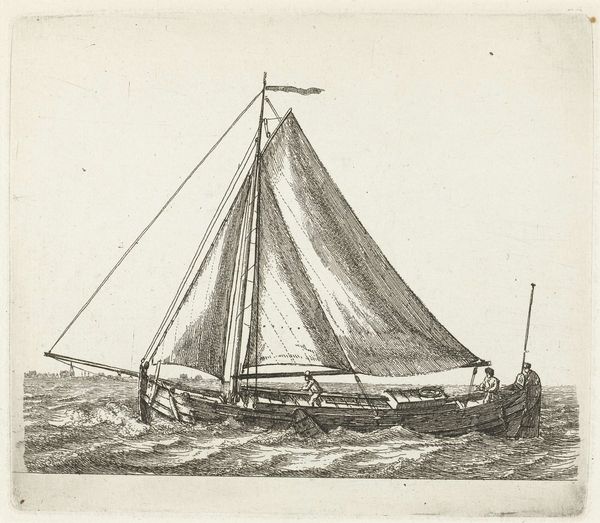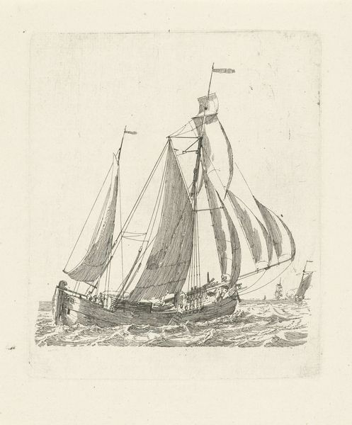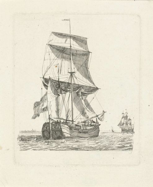 Editor: This is Gerrit Groenewegen’s "Friese turf tjalk," made in 1786. It’s a print, a drawing, actually an etching, and it’s currently held in the Rijksmuseum. I’m immediately struck by how delicate the line work is – almost like a quick sketch. What details stand out to you when you look at the artwork? Curator: I’m drawn to the balance between the detailed rendering of the ship and the suggestive depiction of the water. Note how Groenewegen uses short, repetitive strokes to create the impression of movement on the waves, while the tjalk itself is rendered with finer, more controlled lines. What effect does that contrast have on the composition? Editor: It kind of isolates the ship, highlighting its structure in a dynamic scene. Are those repeated lines significant or do they just make for visual interest? Curator: Indeed, and consider the negative space too! Notice how the emptiness surrounding the boat isolates it. What relationship do you see between the lightness of the sky and the darkness of the hull? Editor: The light, almost aged tone contrasts with the sharp, dark etching of the boat, providing balance but also separating the ship from its environment even more, almost surrealistically? Curator: Precisely! Consider, then, how the material of printmaking lends itself to such contrasts. Notice how this contrast achieves an atmospheric perspective, suggesting the vastness of the sea, despite the work's relatively small scale. What does the simplicity of form contribute to the image as a whole? Editor: It brings it down to the fundamentals of sailing; there's this focus on utility that balances the atmospheric touches you highlighted. I had not seen that so thanks! Curator: Absolutely. The combination of etching technique and the focused study of its core essence result in this artwork's distinct visual presence. What an interesting insight, though.