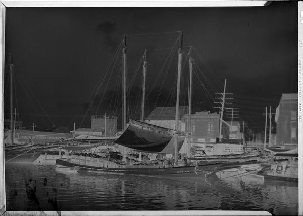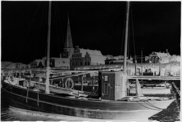 Editor: Here we have an untitled photograph by C. Bennette Moore, showing children with a watermelon on a shore, next to boats. I'm struck by the composition. The foreground seems to be dominated by the children and watermelon, but the boats behind them really draw the eye. What do you see in this piece? Curator: The tonal range in this gelatin silver print is quite interesting. The stark contrast between light and dark creates a dynamic visual field. Note how the artist uses the negative space to frame the central figures. Do you think the artist intended for there to be some deeper symbolic interplay? Editor: I didn't initially, but now that you mention it, the negative space does create a kind of tension. It emphasizes the children's isolation. Curator: Precisely. It's this interplay of form and absence that elevates the work. Editor: That's a great point; I'll definitely look at photographs differently now. Curator: And I, in turn, appreciate the way you noticed the scale shift between foreground and background!