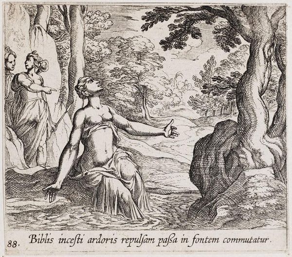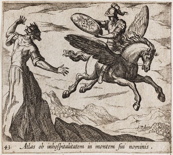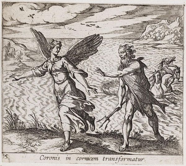 Curator: This etching by Antonio Tempesta, likely created sometime between 1572 and 1630, depicts Proserpina turning Ascalaphus into an owl. It's quite small, just a few inches in both dimensions. Editor: I’m struck by the palpable sense of motion. The turning figure, the billowing fabric – it creates a dynamic scene, despite being a static image. Curator: The density of the etching marks builds up forms and shadows – notice how Tempesta used cross-hatching to describe the landscape and the texture of Ascalaphus' feathers. Consider, too, the labor involved in creating such a detailed image by hand on a metal plate. Editor: It's interesting how the owl-man retains human features – suggesting the persistence of memory and identity, even after transformation. The owl itself has long been a symbol of knowledge and wisdom but also of darkness. Curator: Yes, and the printmaking process itself allows for reproducibility and dissemination of these classical narratives. It democratizes access to these stories, making them available beyond elite circles. Editor: Seeing the transformation visualized like this, you really feel the weight of Proserpina's power and the eternal consequences of Ascalaphus' actions. Curator: It is a small print, but it speaks volumes about the production of images, labor, and the classical tradition. Editor: A fascinating visual encapsulation of ancient myth and enduring symbols.