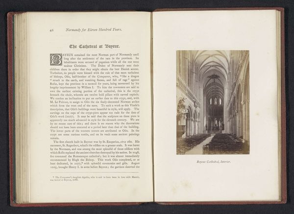 Curator: Here, we're looking at a gelatin silver print dating to before 1865, attributed to Joseph Cundall. It's a photograph of the interior of Rouen Cathedral. What's your immediate reaction? Editor: Stark. That receding perspective, emphasized by the columns, feels almost endless, pulling you into the architecture itself. The tonality emphasizes a certain somber quality to it. Curator: Cundall's choice of gelatin silver perfectly captures the gothic ambition of the cathedral, with its towering columns and ribbed vaults reaching skyward. The photographic process itself, of course, played a part. What considerations do you think Cundall had in the creation of this? Editor: Considering it was before 1865, the time and labor involved were considerable. This isn't a snapshot; it’s a calculated attempt to document and present the grandeur of the space. What purpose would this documentation of space have at that moment? Curator: Think of the cultural and political landscape. Photography was still relatively new. The rise of tourism was underway and these prints made the wonders of medieval architecture more widely accessible. The photograph acts as both documentation and artifact for popular consumption. Editor: It also freezes a particular moment in the building’s lifespan. What we see isn't just stone and light, it's the state of the cathedral at a specific time, shaped by restoration efforts, social changes. In essence, we could study this as historical record as much as aesthetic artifact. Curator: Precisely! The interplay between the sacred and the civic is also visible. Cathedrals such as these often functioned as community hubs. This piece brings that together, demonstrating it with technological and societal movement. Editor: Looking at this print I'm struck by its enduring power. Beyond simply capturing light and stone, this speaks to the social and economic underpinnings of Victorian society's relationship with sacred architecture and photographic craft. Curator: Indeed, it encapsulates both the awe of the medieval and the ambitions of the modern.