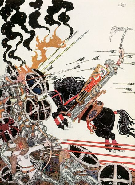 Curator: This vibrant and unsettling mixed-media collage from 1976 is entitled "The Battle of Saporro" by the artist Erró. It’s quite a powerful statement. Editor: Yes, it has an immediately aggressive feel to it. There's a real tension, with a strong emphasis on harsh lines and seemingly contrasting elements—the cartoonish soldiers juxtaposed with figures that recall traditional Japanese art. How was something like this made? Curator: Erró was deeply invested in exploring the interplay of disparate cultural narratives, particularly through the lens of power and representation. The composition layers comic book aesthetics with traditional Orientalist imagery to challenge existing stereotypes and cultural hegemonies. You might say it questions how we consume and construct narratives of conflict and desire, especially through art. Editor: It’s a powerful observation to think about its production; it appears the piece was layered, physically collaged with print media and graphic applications. The juxtaposition certainly creates a disruptive effect. The soft tones and lines used for the reclining geishas clash against the more boldly rendered militaristic figures looming over them. Curator: Exactly, that clash is deliberate. Consider the implications of the male gaze imposed by the soldiers upon the submissive postures of the women. This becomes a complex comment on imperialism, eroticism, and the power dynamics embedded within art itself. Furthermore, think of the position of the weapon laying down in parallel with the female body and its intimate connotations. It challenges the relationship between the feminine and warfare. Editor: Seeing these comic-style figures arranged this way also forces me to think about pop culture's commodification of war and conflict; what sort of production and reproduction of violence did it create? Curator: A critical point. It invites the viewer to question the glorification and sexualization of violence prevalent in both historical art and popular media. Erró's deconstruction of these narratives through his unique blend of pop and political commentary makes this piece undeniably relevant even today. Editor: Ultimately, this layering, materially and thematically, certainly holds up. It is difficult to not contemplate production practices when experiencing such an intriguing arrangement of varied styles. Curator: Absolutely. It’s a challenging, confrontational piece, but one that speaks volumes about the power of art to interrogate the very fabric of our society and cultural past.