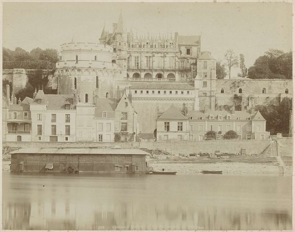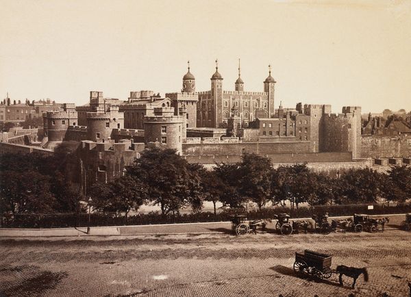 Editor: Here we have "Stadsgezicht van Londen," or "Cityscape of London," a gelatin silver print likely made between 1860 and 1915. The Tower of London dominates the composition. I'm immediately struck by the details achieved through photography and its suggestion of both grand scale and historical weight. What grabs your attention? Curator: As a materialist, I see the gelatin silver print less as a window onto London, and more as an index of industrial processes. The Tower, while undeniably present, is mediated through a specific chemical and mechanical apparatus. The final product is cheap enough for mass consumption. We should consider it as an early form of advertising; a way to circulate images of power and heritage in a rapidly industrializing world. Do you see evidence of the mass production inherent in this image? Editor: I do now! The clarity and detail almost make it seem like an "objective" record, but of course, it’s a very deliberate product, produced for a market. What implications might that have for how we interpret the Tower itself? Curator: I think the critical question is: what's being sold here? Is it London, or the *idea* of London? The reproducibility of the image detaches it from the physical reality of the Tower, turning it into a commodity. Furthermore, the labor that went into capturing the photo and making the print is largely invisible, furthering the illusion of a pristine image that presents itself as fact. Does that change your initial perception of the work? Editor: Absolutely. I hadn't really thought about the image itself *as* an object for sale before, separate from the subject matter. Now, the carriages, the soft focus, even the very picturesque Tower…it all feels curated. Curator: Precisely! It makes you consider what "cityscape" truly means when divorced from its inherent physical processes. Editor: This was so informative. Thinking about the role of material processes has completely reshaped how I interpret this seemingly straightforward image. Curator: Agreed, by recognizing the medium's capacity, we avoid passively absorbing these images, thereby empowering ourselves with visual knowledge.
