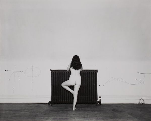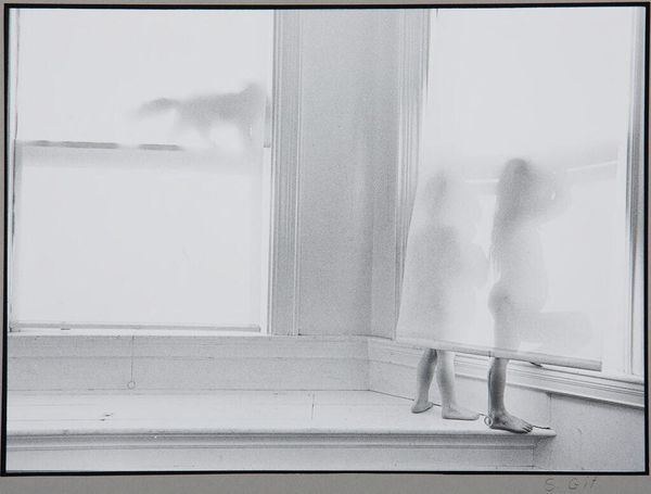 Curator: Susan Gittleman's "Untitled (child and cat)" presents a ghostly vision in monochrome. The print, now housed at the Harvard Art Museums, captures a figure and animal bathed in light. What are your first thoughts? Editor: It feels incredibly fragile, almost ephemeral. The lack of sharp definition renders the subjects vulnerable, existing within a liminal space. It definitely evokes memory and loss. Curator: The soft focus is quite deliberate, I think. Consider the labor involved in achieving that effect in the darkroom. Gittleman would have spent considerable time manipulating the materials to achieve this specific ethereal quality. Editor: Absolutely. And beyond the technical process, there's a potent commentary on the fleeting nature of childhood, the blurring of boundaries between human and animal, and the quiet disruptions within domestic spaces. Curator: I agree. By engaging with the materials and the production process we can also consider the ways in which Gittleman is making visible the unseen labor and the emotional value of these connections. Editor: It leaves you contemplating the intersections of identity and the power of representation, doesn't it? Curator: Indeed. It invites us to consider the many hidden processes involved in both seeing and making.
