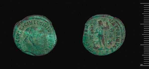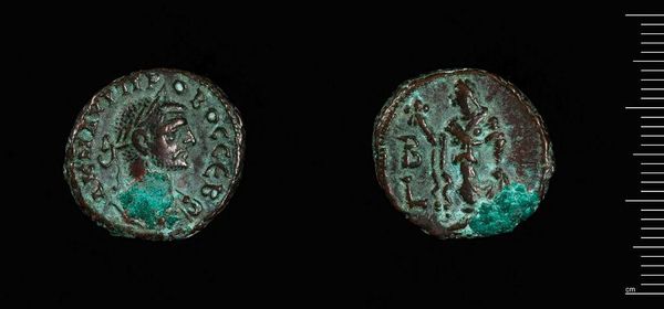 Editor: Here we have a Follis of Justin II from Constantinople, it’s small, metallic, and the green patina gives it a ghostly feel. What stories do you think it holds? Curator: Oh, to hold that little disc! Imagine all the hands it’s passed through, all the whispered transactions, the weight of an empire resting on its worth. It speaks of power, doesn't it? A tangible link to a bygone era. Editor: Definitely. It’s amazing how much history can be packed into such a tiny object. Curator: Right? It's like a little portal, a shimmering echo of Justin's reign. Makes you wonder what he was really like, doesn't it? Editor: It does! I never thought I could feel history in a coin. Curator: Well now you have! Every artifact has a story. Now, what else grabs your attention?