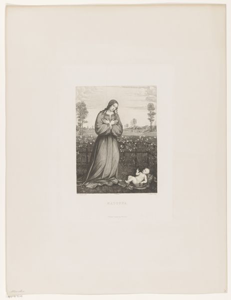 Editor: So, here we have an engraving, a print really, from the 1850s, called *Maria met kind onder een palmboom*, or *Mary with child under a palm tree* by Erich Correns. There’s this hazy, romantic feel to the whole piece. What leaps out at you when you look at this, if anything at all? Curator: Oh, I love how this work makes you feel the stillness in the air, you know? Correns wasn't just sketching Mary and baby Jesus chilling under a palm tree; he's plucking at heartstrings here. I mean, the Romanticism influence is clear, it has that dramatic and idealized sensibility that Romanticism adores. There’s that tension and softness and a feeling for… forever. Editor: The ‘forever’ of motherhood? Curator: Totally. The composition places them sheltered in the cradle of nature itself – it really gives a sense of peace. A very cultivated peace, I feel like this wasn't meant to picture any random mom and babe looking for shelter. There's meaning layered into everything, down to how those lithographic strokes seem to yearn. Correns even suggests paradise itself might be that space that holds these two so closely. It feels intentional, doesn’t it? Like a snapshot from inside a beautiful dream about safety. Editor: Yes, intentional – that is definitely the right word here. So it's this mix of tenderness and also that deliberate setting and styling that gives it this ‘untouchable’ vibe. Almost like they're models acting in a landscape... interesting. Curator: Exactly! So you see how technique can become another layer of meaning altogether, right? And these meanings work together. Editor: Yes, yes it makes sense. So I come away seeing Romanticism using a mother-child scene to portray paradise. Curator: And now I’m looking and understanding this better because of our chat too. Cool.