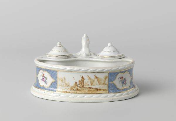 Editor: This is the "Ink Stand," made of earthenware around 1777 to 1790 by Porseleinfabriek Den Haag and housed at the Rijksmuseum. It has an almost theatrical quality, doesn't it? All the elaborate decoration and flourishes give a sense of ceremony to something as mundane as writing. What strikes you when you look at it? Curator: I’m immediately drawn to the symbolic weight of the floral motifs. Think about the cultural moment; the Rococo era embraced ornamentation, yes, but flowers also held layers of meaning. Roses, like we see painted on the bell, often symbolize love, beauty, and secrecy. What might that suggest about letter writing in that time? Editor: That letter-writing was maybe a more intimate or romantic act? That’s interesting. Curator: Precisely. Consider the color too, this restrained use of lilac and gold. Purple has long been associated with royalty, and gold, of course, speaks to wealth and status. What stories might these colors tell about the owner and intended recipient? Were they trying to project a certain image? Editor: It’s easy to overlook the individual symbols. I was focused on the overall opulence, not the nuances. Curator: And what about the lion heads supporting each piece? What feelings do you associate with the lion as a symbol? Editor: Strength, definitely, maybe authority. They feel almost contradictory combined with the delicate flowers. Curator: Perhaps. Or, maybe that contrast speaks volumes about the complexities of power and vulnerability within the act of communication itself. Letters, after all, can be weapons or declarations of love. The images are carefully chosen. Editor: That’s a compelling idea; it gives me a lot to consider regarding the piece beyond just surface-level beauty. Curator: And hopefully provides a more nuanced lens through which to appreciate not just the object but the era in which it was created!