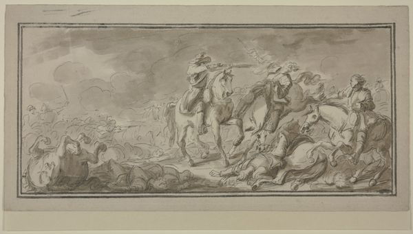 Editor: This is "Ein berittener König weist einem Krieger zu Pferde den Weg zu einer Ruine, über der ein Stern strahlt," a pencil drawing made in 1846 by Victor Müller. The figures feel so theatrical, like a scene from a play, especially with the symbolic ruin and shining star. What stories do you think it might be telling? Curator: It resonates deeply with archetypal imagery. We see the king, a clear father figure, directing the younger warrior. This visual language speaks of guidance, legacy, and the cyclical nature of power. Note how the ruin signifies not just physical decay but also a historical weight and a connection to ancestors. The star? That is a fascinating guide for these figures; does the celestial imagery of hope transcend generations? Editor: Hope despite the ruin – that's powerful! The Romantic era was into that. Do you think there’s any specific myth or historical event Müller might have been referencing? Curator: Perhaps. But Romanticism prized a certain universalism. I see here something that aims to tap into the viewer’s own sense of longing and heritage. Each carefully drawn line serves as an invitation to find personal significance in its visual language. Think, too, about the sword at his side... is that a symbol for violent conflict, defense, or is it about honor? Editor: Hmm, that makes me wonder about the act of drawing itself, then, too. Müller could be asking us what it means to create a world, or rebuild one, through imagery. Curator: Precisely! It's about making memory and endowing it with new meaning. The artist becomes a kind of mythmaker. What do you make of the other supplicant figure there? Is she hoping to also to transcend to another world? Editor: This was fascinating – seeing how universal themes are coded in what seemed like a specific historical scene. I will look at academic Romanticism with a different eye now. Curator: Agreed! The enduring power of symbols, even subtly rendered, resides in their ability to continually be reimagined by new generations.