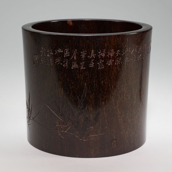 Covered boxes like this are often used to serve the small cakes provided during tea gatherings to cut the bitter taste of the green tea powder. This kashibako, designed by Kamisaka Sekka, hints at the wabi aesthetic, which prizes naturalistic or imperfect objects. Though the box’s smooth, round shape stands in direct contrast to the rustic ceramics favored by wabi style practitioners, the rough grain of the wood is retained on the outside of the piece. The exterior of the container is covered in a thin coat of clear lacquer, lending the natural wood a glossy finish, while the lid is coated in black lacquer with a design of gentians in silver and gold.