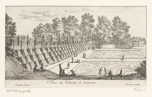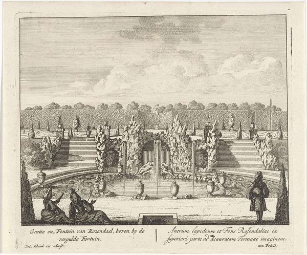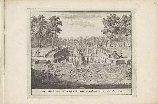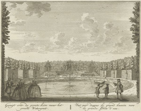 Curator: This engraving, dating from about 1740, offers a peek into the luxurious world of the Dutch elite during the Baroque era. It is entitled "Vijver in de tuin van Huis ter Meer te Maarssen", by Hendrik de Leth, and it currently resides in the Rijksmuseum. Editor: My first impression is one of meticulous order, almost theatrical in its precision. Look at the symmetry—the reflecting pool, the placement of the trees, the perfectly positioned figures. Curator: Precisely. This wasn't just a garden; it was a stage for demonstrating wealth, taste, and power. Maarssen, where the Huis ter Meer was located, was a popular summer retreat for Amsterdam's wealthy merchants and regents. Places such as this became settings where they displayed their cultural sophistication through garden design inspired by the French Baroque style. Editor: The cascading water feature, the kaskade in the title, functions almost like a proscenium arch, doesn't it? Leading your eye toward the more naturalistic river landscape beyond. It cleverly merges constructed nature with actual nature. And note how light is employed, contrasting bright and dark surfaces to direct attention to details. Curator: I would agree, although light may also speak to the period's complex relationship between humans and nature; there is this clear attempt to master nature, evident from how they designed garden spaces. Also, gardens allowed aristocrats to manage the production of their identities in a way accessible and pleasing to others. Editor: It’s also worth considering how de Leth translates the visual depth using linear perspective, the details becoming more attenuated toward the horizon. This heightens the sense of vastness, making the estate seem even grander than it might actually have been. And, what appear to be swan details introduce an aristocratic aesthetic. Curator: Indeed. De Leth, while perhaps not an artist in the contemporary sense of the word, played a crucial role in disseminating the ideals and aspirations of the Dutch elite. Prints like these circulated widely, showcasing the lifestyle and values of a specific class. They weren't just depicting gardens; they were selling a social fantasy. Editor: I can appreciate how the form itself, with its careful arrangements and technical skill, embodies a set of specific aspirations of its time. Thank you for illuminating its greater context for me. Curator: My pleasure. It is important for all of us to be more aware of the powerful ways that even gardens reflect—and reinforce—historical values and class hierarchies.