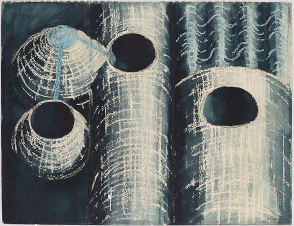 Editor: This is Stephen Cox's "Study for Ganepathi and Devi." The composition is very simple, just two dark shapes against a light blue background. What do you see in this piece? Curator: Well, immediately, the shapes evoke both ancient pillars and abstracted figures. The title hints at Hindu deities, but these forms are stripped down, almost primal. Do you notice how the negative space around them feels as significant as the figures themselves? It's as if the cultural memory of these deities is being excavated, revealing their essential forms. Editor: I see what you mean, like the essence of the forms is what's important. I didn't notice the negative space before! Curator: It's about revealing the underlying symbolism, the persistent visual language that transcends time. Editor: Thanks. I'm really thinking about symbols differently now. Curator: My pleasure. It's about seeing the echoes of the past.