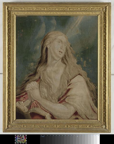 Curator: Here we have Dante Gabriel Rossetti's "Head of a Woman (Study for 'Roman Widow')," residing at the Harvard Art Museums. The dimensions are roughly 65 by 52 centimeters. Editor: It’s immediately striking how subdued the palette is; a sort of earthy melancholy seems to emanate from the piece. Curator: Indeed. Rossetti's Pre-Raphaelite focus often positioned women as idealized, yet tragic, figures within the social constraints of the Victorian era. The 'Roman Widow' concept itself draws from historical and literary tropes of mourning and female bereavement. Editor: I'm curious about his choice of materials here. It looks like a mixed media approach, perhaps chalk and pastel, that lends itself to the soft, almost ethereal quality of the skin tones. This seems to deliberately contrast with the opulence often associated with Roman aristocracy. Curator: Absolutely, exploring the materiality and technique in relation to the social context illuminates Rossetti's commentary. The artist perhaps used those choices to subtly undermine conventional representations of women in power. Editor: It's a compelling combination; that emotional rawness achieved through the artist's process is fascinating. Curator: I agree; considering the work through these lenses really enhances the narrative it presents.