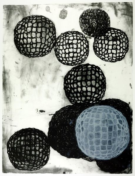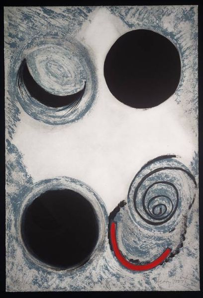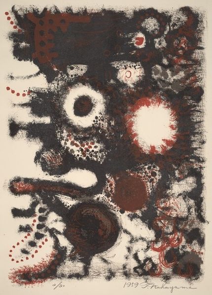 Curator: Here we have "Circus," a 1961 monotype print by Hideo Hagiwara, an artist known for his abstract explorations. Editor: Wow, it looks like controlled chaos! All these shapes tumbling over each other, like performers scrambling for a spotlight. There's a frantic energy about it that’s hard to ignore. Curator: Indeed. Hagiwara was deeply engaged with Abstract Expressionism, particularly its emphasis on process and gesture. Consider the use of line and form here: How does it reflect the tensions within postwar Japanese society? Editor: Postwar tension expressed as a bunch of whirling donuts and slightly soggy dice? I dig it! The repetition, maybe, is about feeling stuck? Doing the same old tricks, but everything feels off-kilter? Curator: The "sameness" you observe might represent societal pressures, challenging individuality. Hagiwara pushes back against established artistic norms while reflecting a collective unease felt within that specific historical moment. Editor: Maybe that's why there are these messy splatters, these unexpected textures—almost like tiny acts of rebellion against the neatly arranged circus act. It feels very...raw. You know, like an artist really getting their hands dirty in the process. Curator: It is a great example of Hagiwara’s experimentations with printmaking. "Circus" embodies his engagement with global abstract trends while articulating particular cultural and political realities in Japan at that time. Editor: Thinking about the "circus" part… aren't circuses about wonder, and magic? This makes me think, can beauty be born of unease, from that raw feeling? Because honestly, the whole is strangely... beautiful, even if it's a slightly scary sort of beautiful. Curator: I agree completely. This is Hagiwara prompting us to look for deeper meanings and acknowledge complexities—where tension becomes a catalyst for profound creative expression and, ultimately, even beauty. Editor: Definitely makes you rethink the idea of the circus. I'll be humming calliope music with a slightly cynical grin on my face all day now. Curator: And I'll be contemplating the artist’s social critique while simultaneously admiring his mastery of the monotype medium. Thank you for sharing your immediate impressions with us!